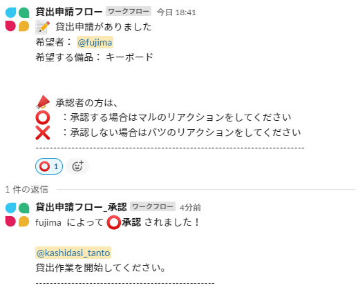投稿された申請内容に対して、絵文字リアクションで承認か否認のリアクションを行います。承認の絵文字リアクションをすればスレッドに承認メッセージが投稿され、否認の絵文字リアクションをすればスレッドに否認メッセージが投稿される仕組みを作ります。