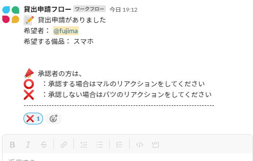 否認の絵文字リアクションで差戻のメッセージなどを投稿します。