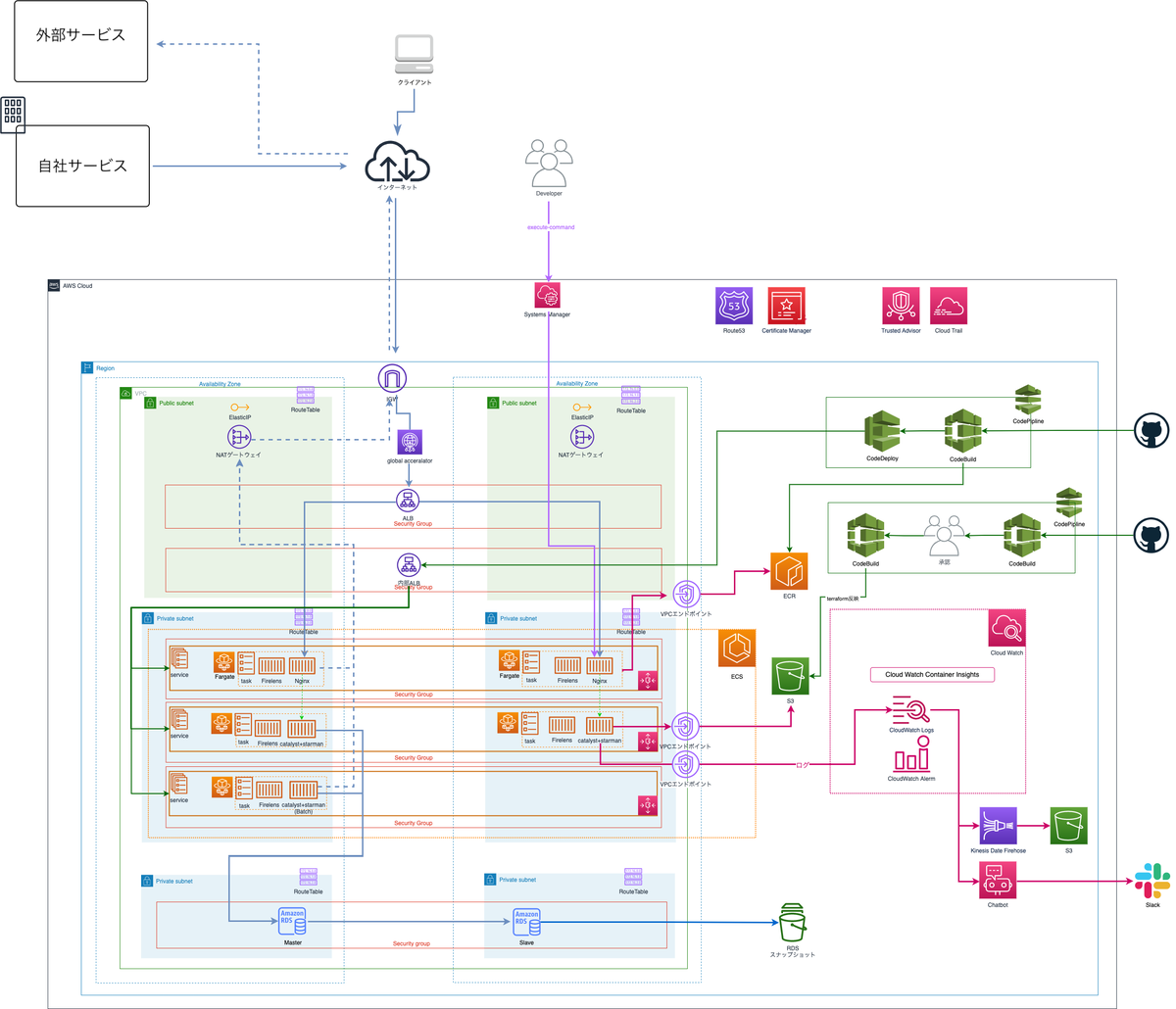 上記がAWS構成図の全貌です。こう見るといろんなサービスを利用しているのがわかると思います。