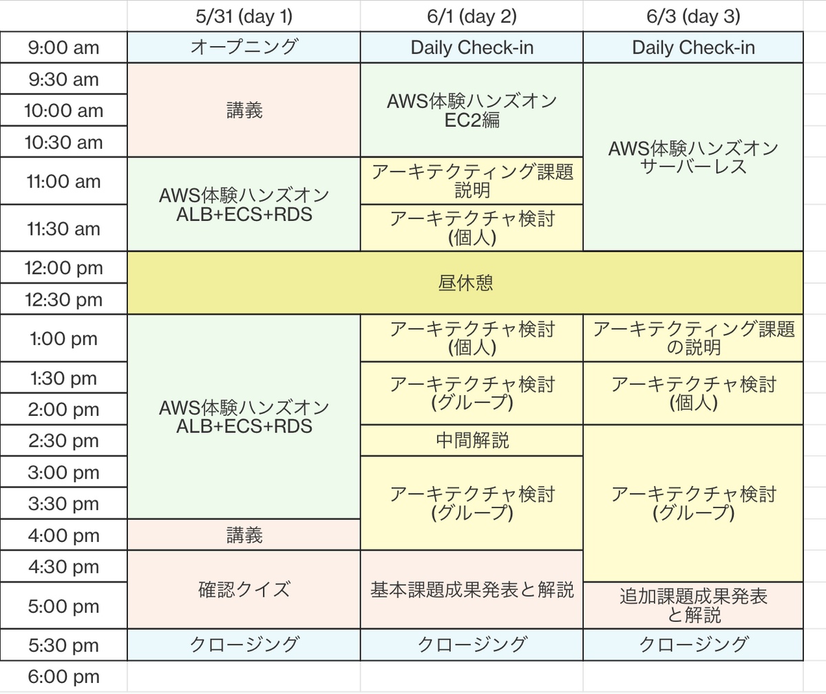 セミナーは↓のように9:00~18:00で3日間行われたので、かなりしっかりとAWSの知見を深めることができたと思います。