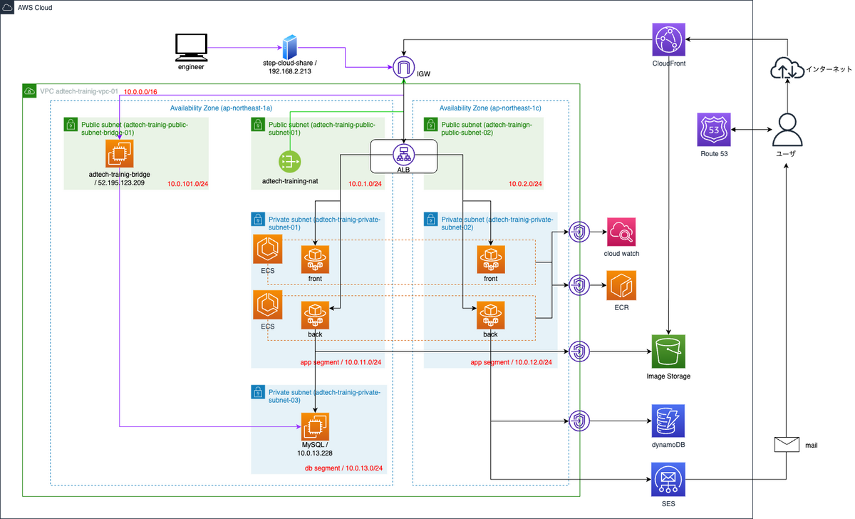 また、インフラ研修ではALBに直接アクセスする構成を取っていましたが、チーム開発では間にCloudFrontを挟んで画像などをキャッシュするようにしています。