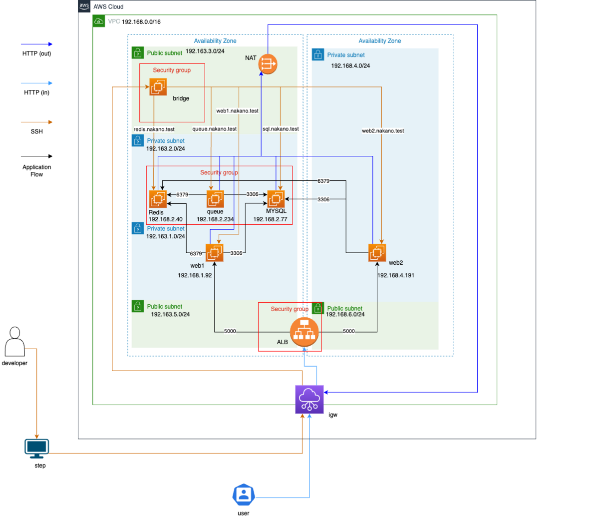 内容としては構成図に従ったインフラ構築が5日間、IaC研修が2日間、障害体験が2日間で計9日間に渡ってインフラの基礎をみっちり叩き込みました。