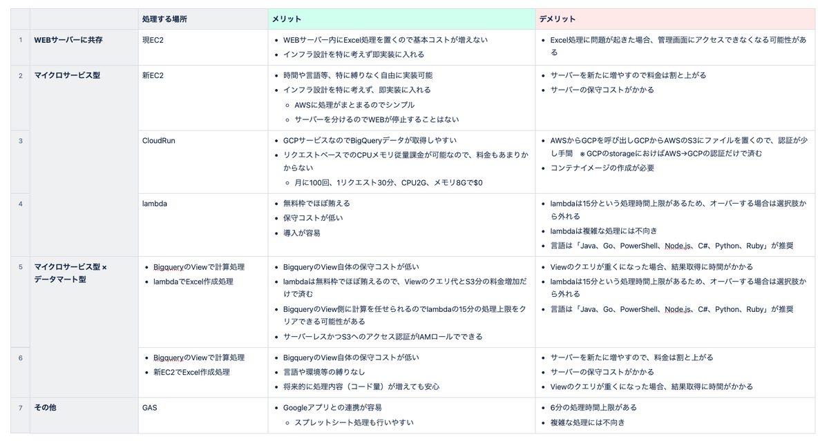こちらはExcel出力機能の処理場所を決定するためにまとめた表です。