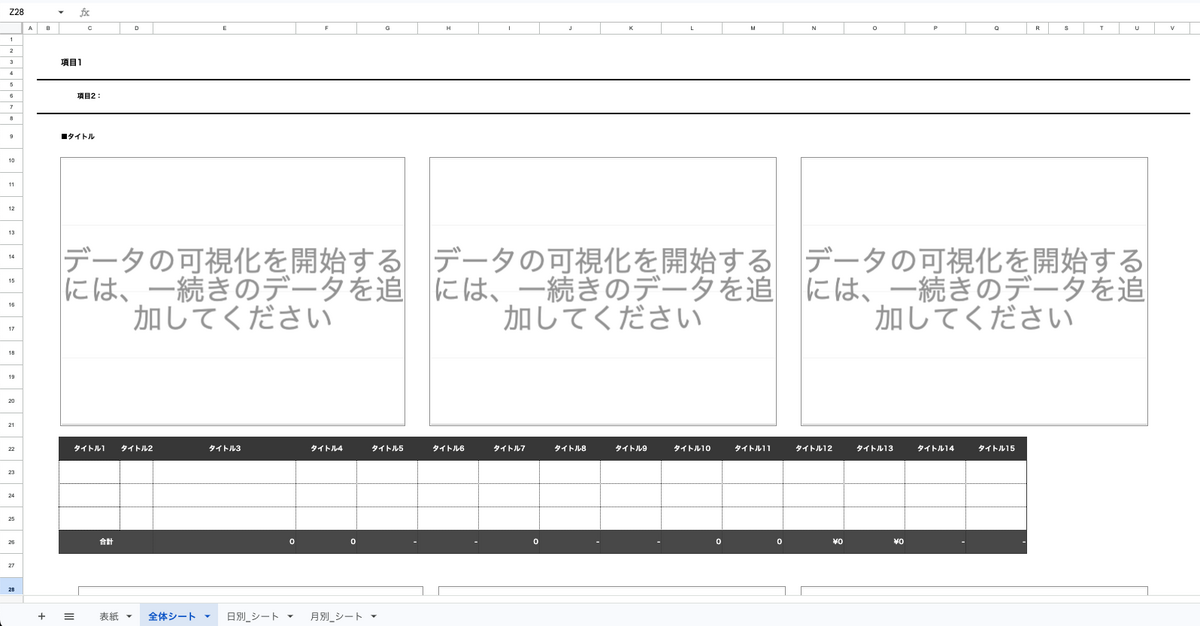 雛形スプレッドシートには値が入っていないテーブルとグラフを用意します。