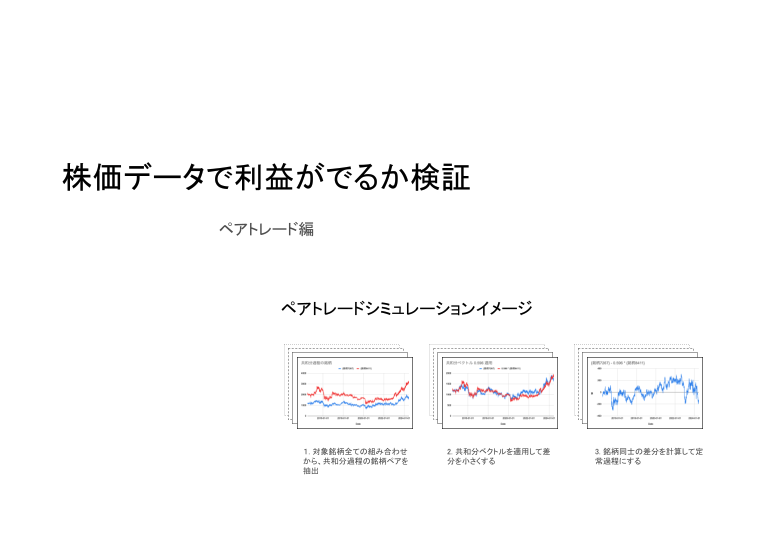 ペアトレードという似た値動きをする銘柄を組み合わせて、ロングとショートで売買する手法で儲けられるかシミュレーションをした話。