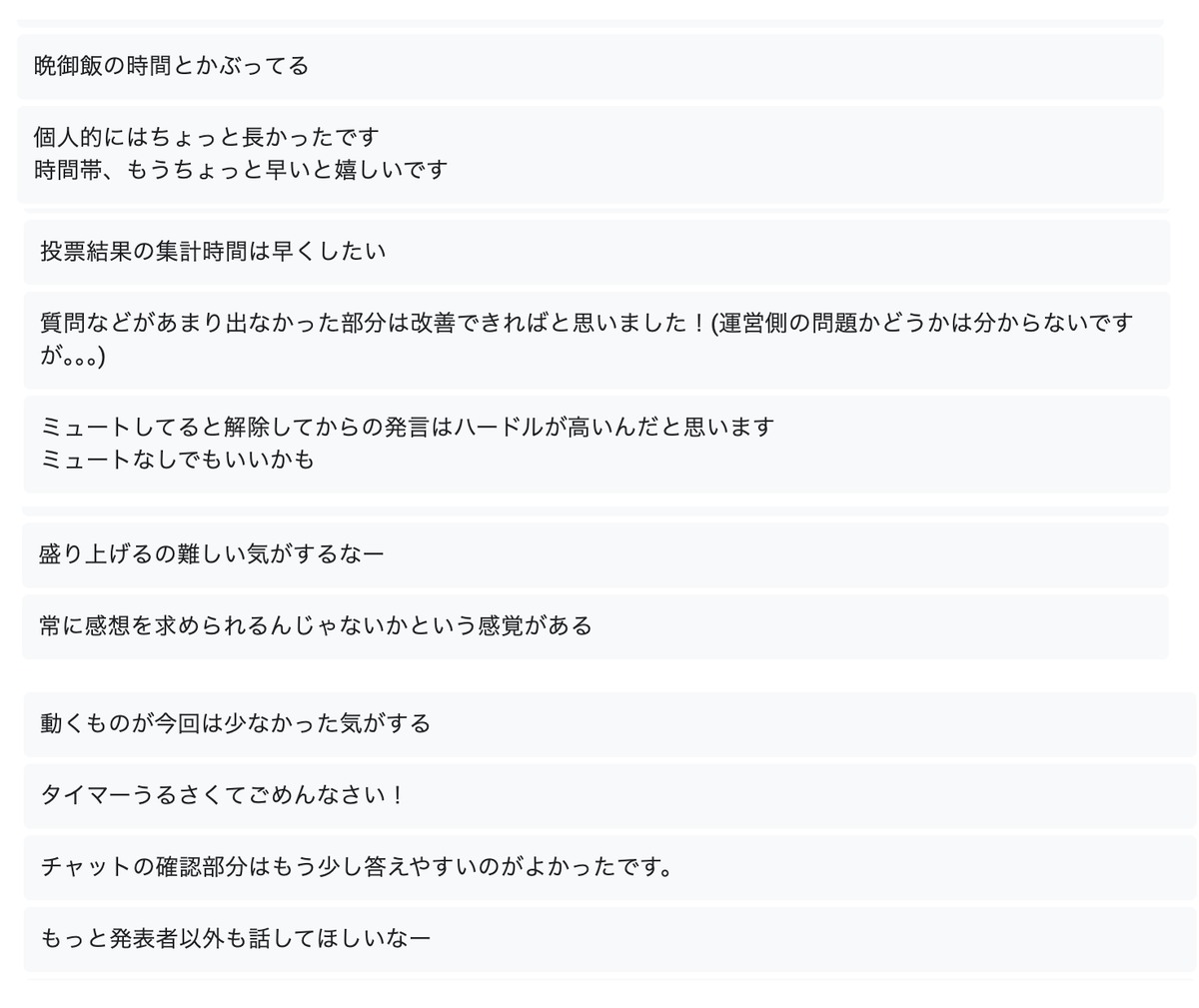 高木さん:発表後の感想を求める取り組みを行って会話を促したかったというのがあった。参加者からの感想や質問がないと、発表者的に内容が良かったのかな?って不安にさせてしまうから。指名という形でやってみたけどいきなり当てるのはやめてほしいという声が多かったのでやめることに……。