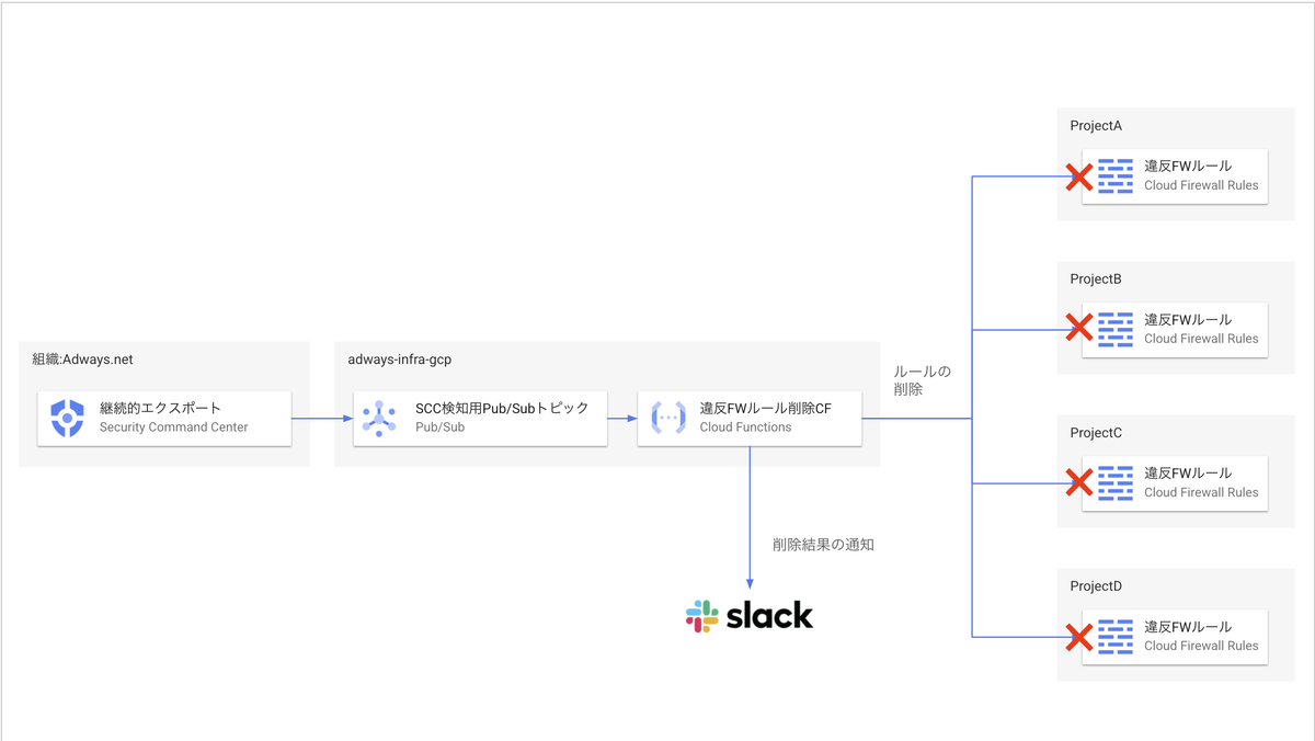上記の構成図の通り、SCCで検知した脅威の情報をPub/SubでCloud Functionsに送信し、各プロジェクトのFWルールを削除します。