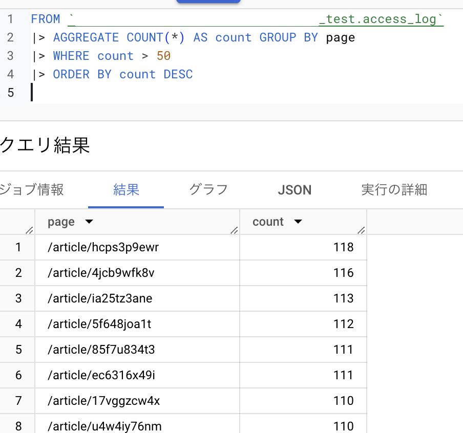 FROM `my-project.my-dataset.access_log` |> AGGREGATE COUNT(*) AS count GROUP BY page -- |> WHERE count > 50 -- |> ORDER BY count DESC