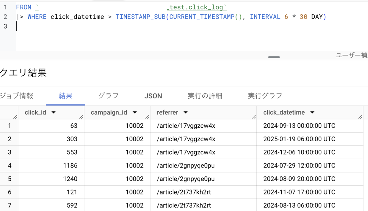 FROM `my-project.my-dataset.click_log` |> WHERE click_datetime > TIMESTAMP_SUB(CURRENT_TIMESTAMP(), INTERVAL 6 * 30 DAY)