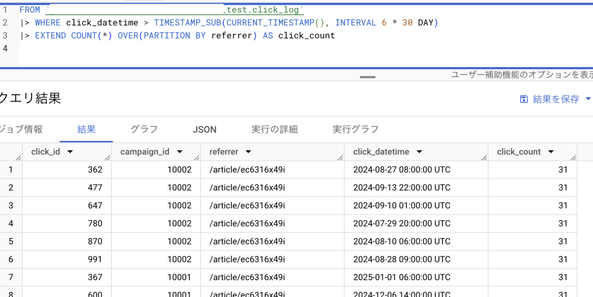 FROM `my-project.my-dataset.click_log` |> WHERE click_datetime > TIMESTAMP_SUB(CURRENT_TIMESTAMP(), INTERVAL 6 * 30 DAY) |> EXTEND COUNT(*) OVER(PARTITION BY referrer) AS click_count