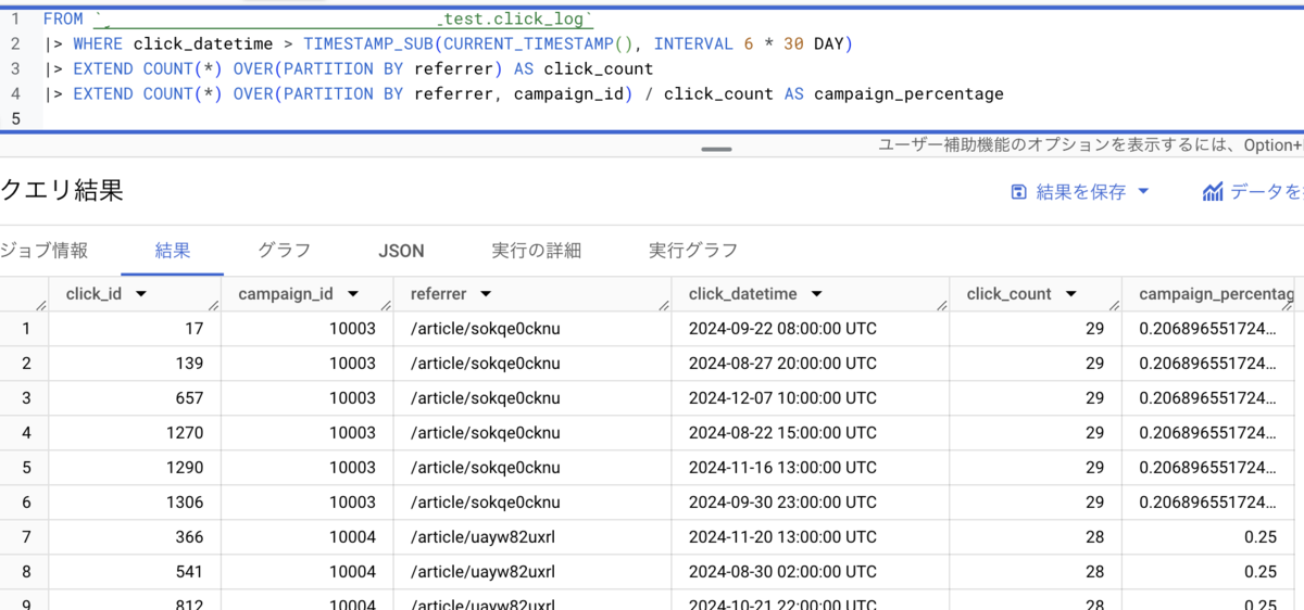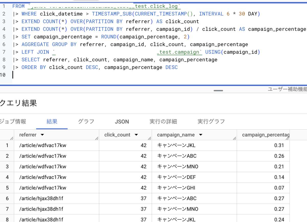 FROM `my-project.my-dataset.click_log` |> WHERE click_datetime > TIMESTAMP_SUB(CURRENT_TIMESTAMP(), INTERVAL 6 * 30 DAY) |> EXTEND COUNT(*) OVER(PARTITION BY referrer) AS click_count |> EXTEND COUNT(*) OVER(PARTITION BY referrer, campaign_id) / click_count AS campaign_percentage