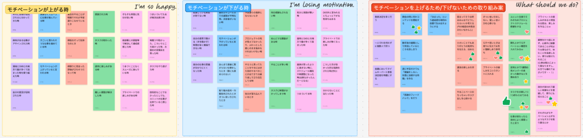 - モチベーションみたいなところ話してこなかったので、他の人の上がったり下がったりが知れたのと、初めてそういう取り組みが出来たので良いなと思いました。