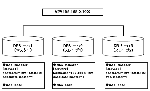 # vi /etc/app1.cnf [server default] manager_log=/var/lib/mysql_mha/log/masterha/app1/app1.log manager_workdir=/var/lib/mysql_mha/masterha/app1 password=レプリケーション用ユーザーのパスワード remote_workdir=/var/lib/mysql_mha/log/masterha/app1 ssh_user=mysql user=レプリケーション用 [server1] hostname=192.168.0.101 candidate_master=1 [server2] hostname=192.168.0.102 candidate_master=1 [server3] hostname=192.168.0.103 #no_master=1