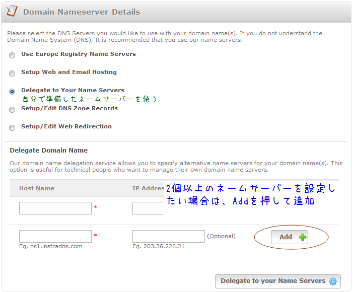 一度独自のネームサーバーを設定すると、EuropeRegistryの設定(6・7該当)は選択肢から消えてしまいます。その場合は、一度「Use Eusope Registry Name Severs」に設定すると現れます。