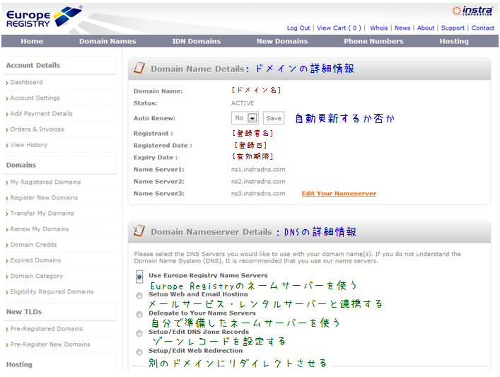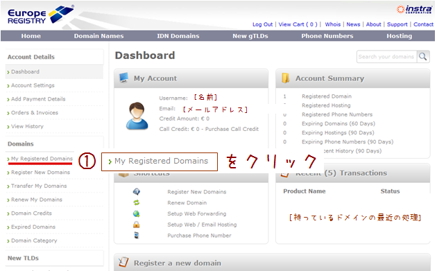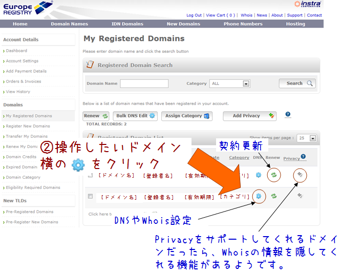 ドメインの設定は、My Registered Domains(購入したドメイン一覧)から行えます。