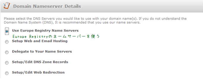 まだドメインを使わない場合は、Use EuropeRegistry Name Seversを設定します。