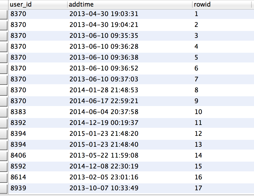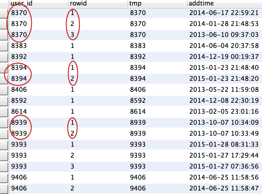 user_id,if(user_id=@seed,@rowid:=@rowid+1,@rowid:=1) as rowid,if(user_id=@seed,@seed,@seed:=user_id) as tmp,addtime