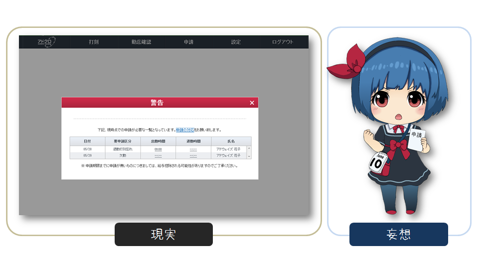 とぷりぷり怒りながら、打刻修正の申請書を突き出すアドクロたんが脳内再生されます。