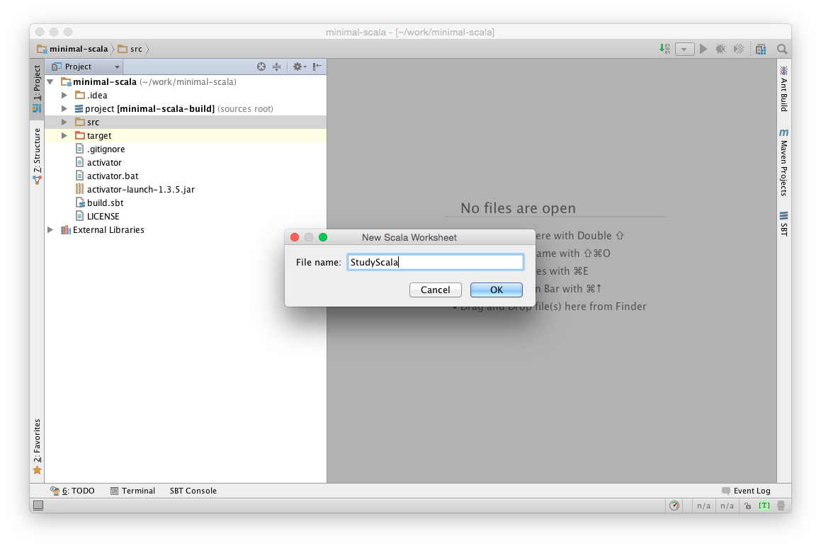 3. 左サイドメニューのProject上で右クリック > New > Scala Worksheetを選択します。