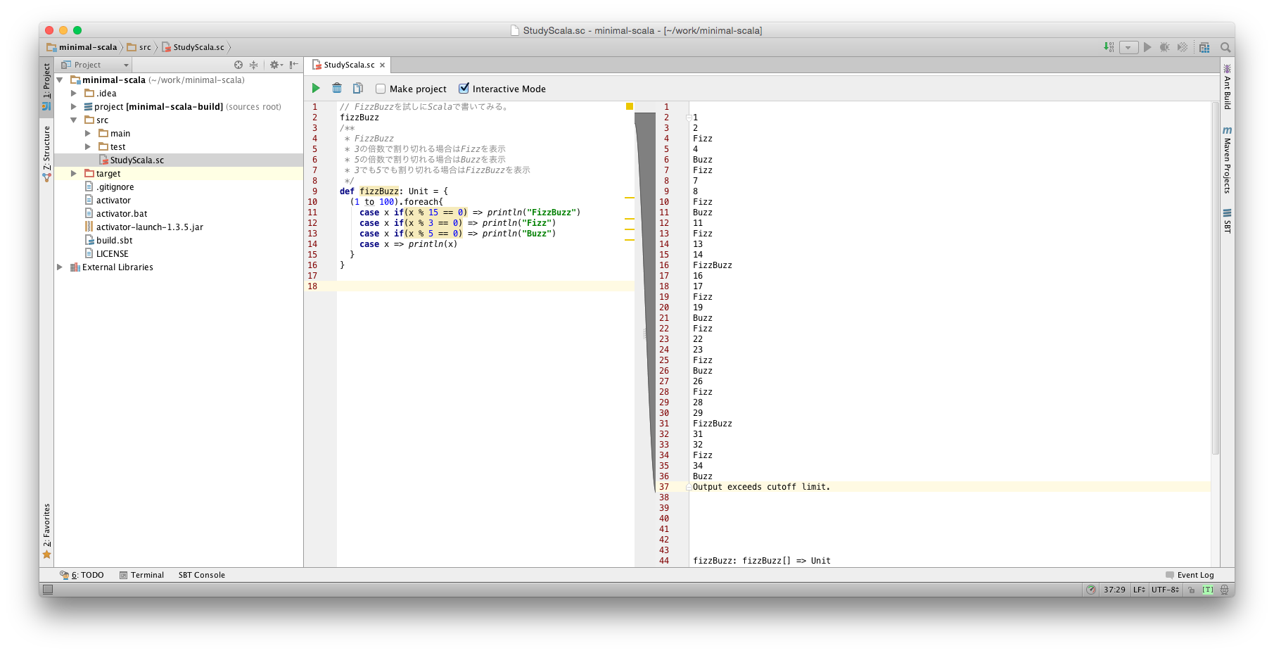 Worksheet上で確認すると・・・// FizzBuzzを試しにScalaで書いてみる。